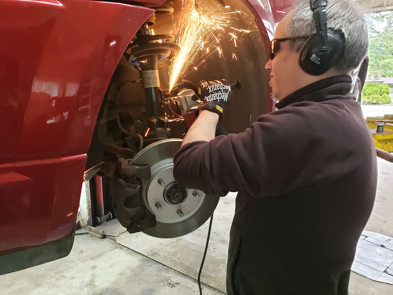 Begrijp ik….waar wil je dat ik wat afslijp? We fixen een geluid van staal op staal als je door een kuil in de weg gaat. Joe legt uit dat toen hij net de auto had gekocht, het geluid er nog niet was. Jack en ik kijken elkaar aan en zeggen tegelijk, das een heel aantal jaren terug Joe.