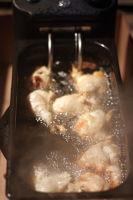 Het beslag van de oliebollen is een geheim, het is zelfs zo'n geheim dat inmiddels mensen in de auto stappen om de oliebollen op de observatory te komen halen. Formaat iets groter dan een golfbal vol met krenten ...en...en....en...en...spul uit een snaps fles. Michelle heeft het liefst een oliebol zo groot zodat ze er een aantal dagen achter elkaar van kan knabbelen. Over het bakken gesproken, - 14 is een temperatuur dat je het beste kunt blijven drinken en kunt opschieten met je beslag ( als je niet oppast bevriest het!)